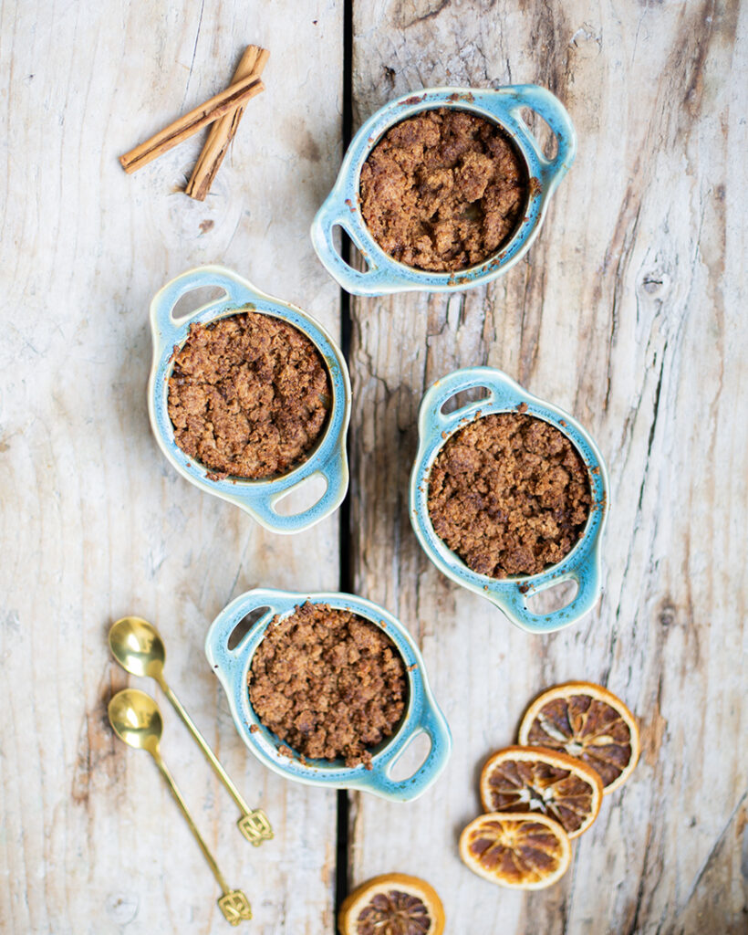 Doe de bloem, donkerbruine basterdsuiker, gember, kaneel, nootmuskaat, gemalen kruidnagel en een snuf zout in een kom. Snijd de koude roomboter in blokjes en kneed dit met je vingertoppen tot een kruimeldeeg. Verdeel het kruimeldeeg over de ovenschaal of ovenschaaltjes.