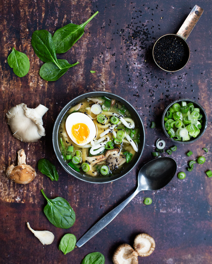 Pel de eieren. Serveer de soep met de bosui, een eitje, zwart sesamzaad en stokbrood. Dit is een vrij lichte soep. Ben je een grote eter dan heb je misschien niet genoeg aan een bord. Je kunt dan voor 4 personen het recept verdubbelen.