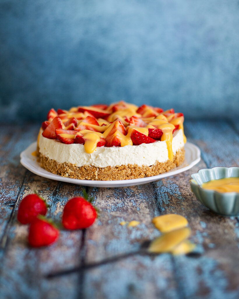 Voor het serveren verdeel je de aardbeien over de taart en drizzle je de Advocaat erover.