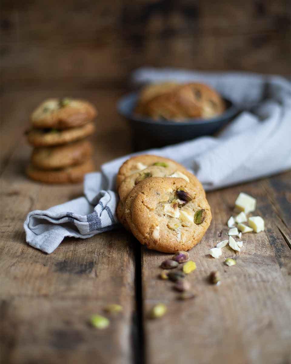 Bekleed een bakplaat met bakpapier. Rol van het deeg bolletjes (21 stuks) van ongeveer de grootte van een walnoot. Leg de bolletjes deeg op de bakplaat (ver genoeg uit elkaar). Druk voorzichtig de rest van de witte chocolade en pistache erin. Bak de koekjes goudbruin in de oven in 13 tot 14 minuten. Bak de koekjes in twee of drie keer als er niet voldoende plek op de bakplaat is om de koekjes in een keer te bakken.
