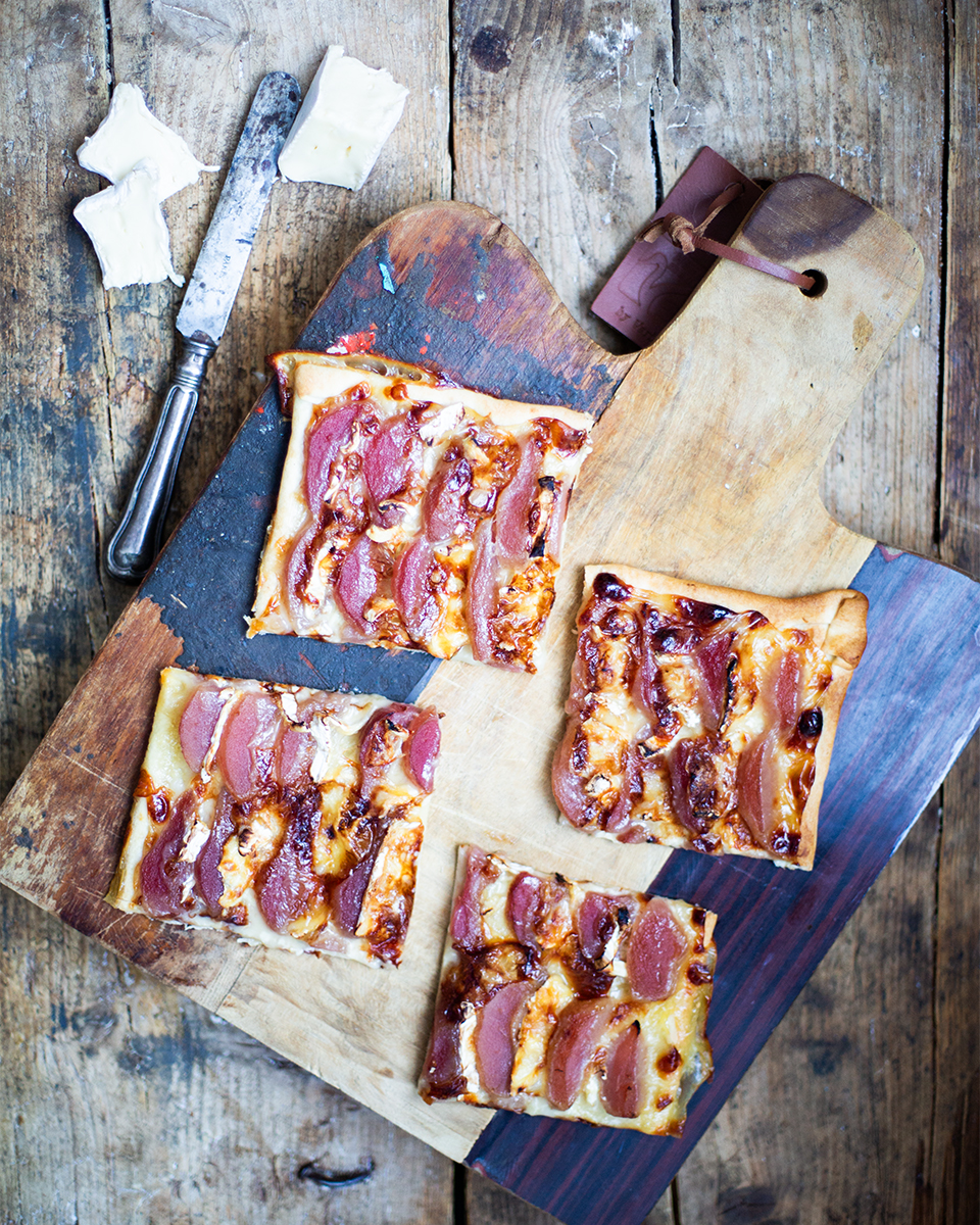 Ik ben dol op kaas! Een echte kaaskop kan ik mezelf wel noemen. Ik lust eigenlijk alle soorten kaas. Van romige jong belegen kaas tot lekkere sterke blauwe kaas. Camembert is en blijft wel één van mijn favoriete kazen. Lekker uit de oven als een mini kaasfondue op zaterdagavond. Heerlijk. Ik maakte deze lekkere plaattaart met knapperig flammkuchendeeg, zoete stoofpeertjes en gesmolten camembert. Geniet ervan!
