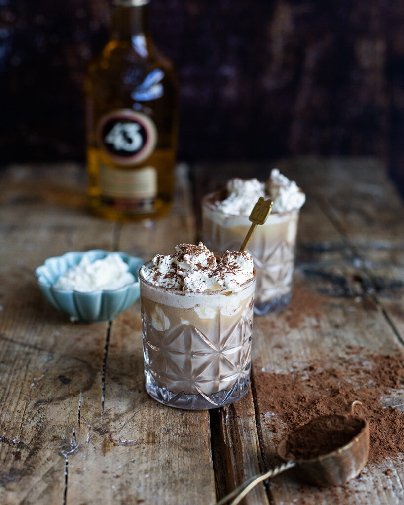 Doe de Licor 43 in het glas (of glazen, als je twee kleinere maakt). Giet de espresso en chocolademelk erbij. Spuit er een flinke dot slagroom op en serveer.